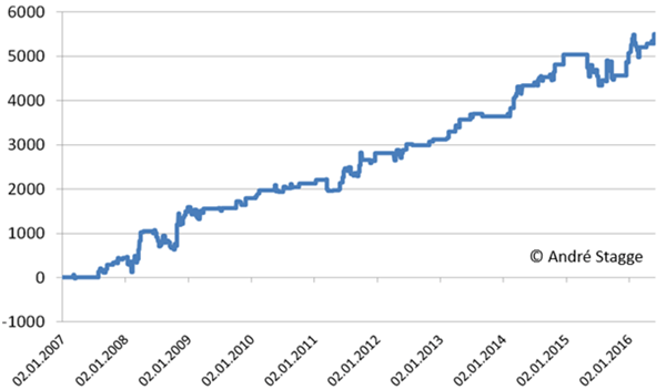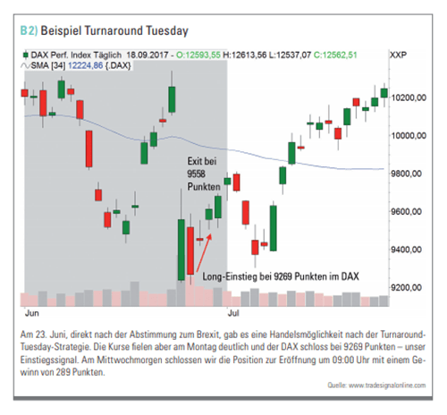 Im August 2015 hatte die “Tuesday Turnaround” Strategie einen weiteren bemerkenswerten Erfolg. Am 24. August geriet der DAX unter Druck, was zu einem Ausverkauf führte. Das niedrigste Niveau, das der Markt erreichte, war 9.338 Punkte bei einem späteren Schlusskurs von 9.648 Punkten. Am Dienstag setzte der Markt seine Erholung fort. Der Investor, der am Dienstag zum Marktschluss verkauft, hat 480 Punkte in weniger als 24 Stunden erzielt.